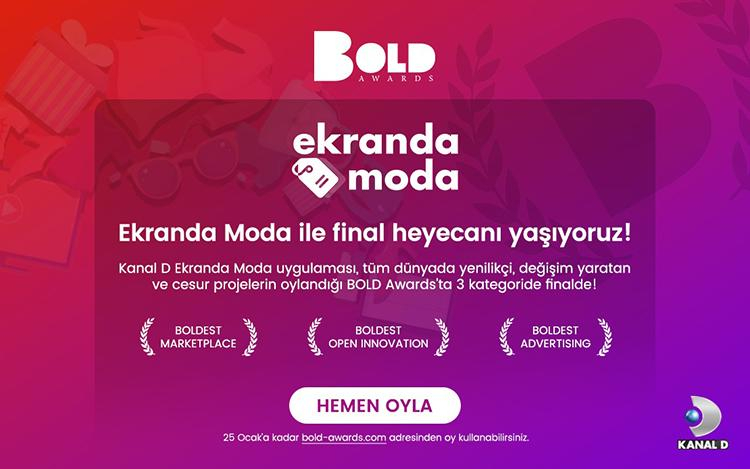 Kanal D’nin dizilerinde yer alan ürünleri marka, fiyat ve ürün detayı bilgileriyle kolayca buluşturan teknoloji “Ekranda Moda”, uluslararası oylamada finalistler arasında yer almaya layık görüldü. Pazara yön veren iş birlikleriyle, kullanıcı dostu bir teknoloji olarak hayata geçirilen “Ekranda Moda” yenilikçi, değişim yaratan ve cesur projelerin oylandığı BOLD Awards’ ta finale kalmanın heyecanını yaşıyor.