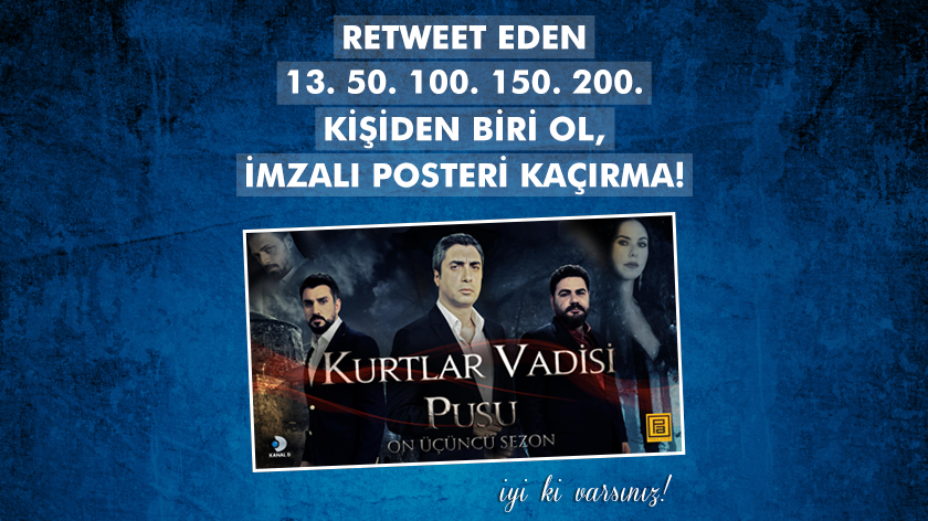 Kurtlar Vadisi Pusu’nun 13. yılı sebebi ile sosyal medyada “#KurtlarVadisi’nde 13. yıl rüzgarı! Bu tweeti retweet et, imzalı Kurtlar Vadisi Pusu posteri kazanma şansı yakala!” tweet’ini retweet eden 13. 50. 100. 150. ve 200. kişiye, dizinin imzalı posteri hediye edilecek.